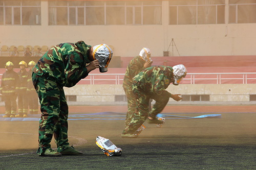 第二部分正式进入消防演习。首先安全保障部的人员为全体学生做了灭火逃生的示范,再由我校的40名2016级军训学生代表进行演练。模拟真实的火灾现场,最大限度还原火情,王毅参谋对现场的灭火器、灭火毯、自救式逃生呼吸器等器具及整个灭火逃生过程做了详细解说。我校的学生代表按照逃生技巧、器具的正确使用方式完成了本次演练。