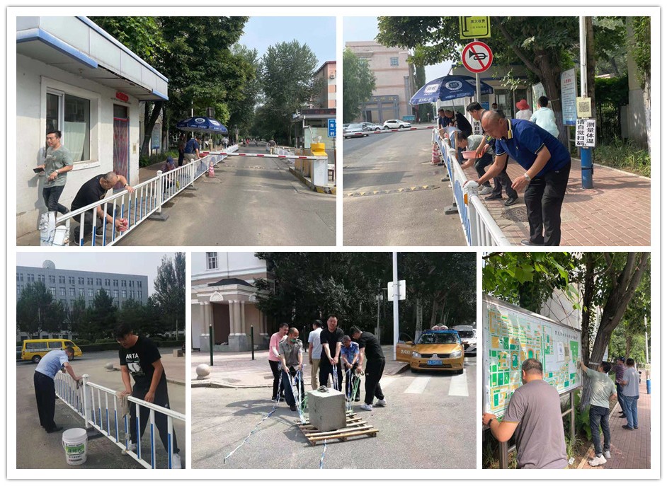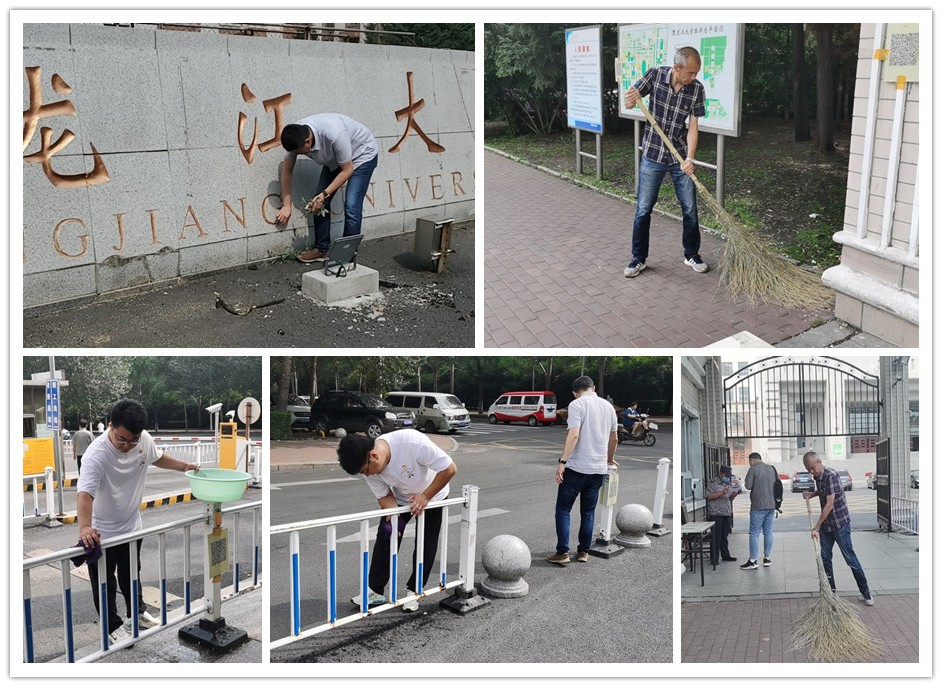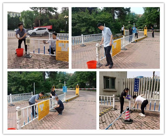 以党小组为单位分别擦洗学府路正门、北二门、测绘路汇文楼正门、丽泽园正门交通护栏及清扫周边卫生。